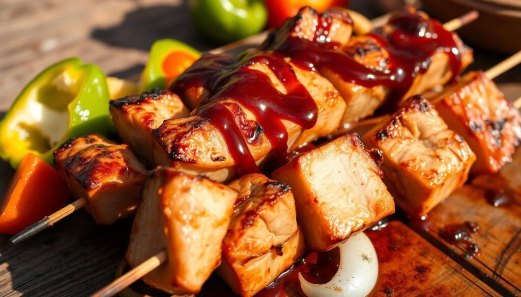 Pork kebabs or skewers are a favorite for outdoor cooking. They mix pork cubes with colorful veggies. The secret to tasty grilled pork cubes is a good marinade. Use herbs, spices, and lemon juice or vinegar to add flavor.